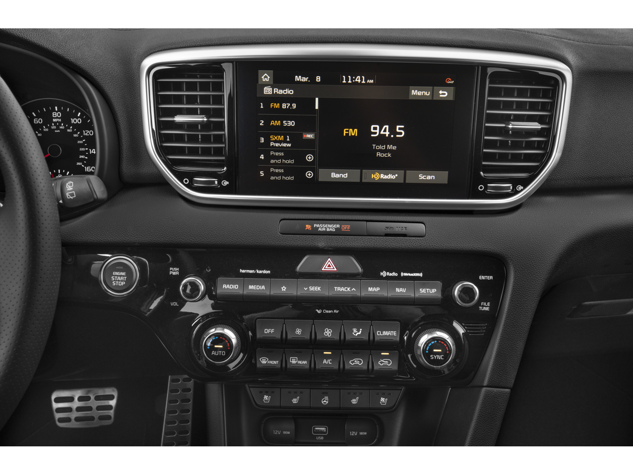 - Radio: AM/FM/SiriusXM Audio System -inc: 8" touchscreen, navigation, 8 speakers including subwoofer, 320 watt harman/kardon premium audio, Clari-Fi, UVO telematics, Apple CarPlay & Android Auto, voice recognition, USB/aux input ports, wireless phone charging, steering wheel controls and Bluetooth® w/audio streaming