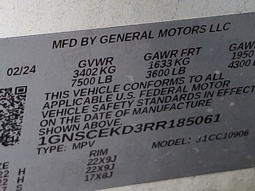 THIS VEHICLE INCLUDES THE FOLLOWING FEATURES AND OPTIONS: License Plate Front Mounting Package, Preferred Equipment Group 1SP (10-Way Power Driver & Passenger Seat Adjusters, 1st & 2nd Row Color-Keyed Carpeted Floor Mats, Auto-Dimming Inside Rear-View Mirror, Bose 9-Speaker Stereo Audio System Feature, Bright Front & Rear Door Sill Plates, Color-Keyed Carpeting Floor Covering, Driver & Front Outboard Passenger Airbags, Enhanced Driver Information Center, Floor Console w/Storage Area, Hands-Free Rear Power Programmable Liftgate, Heated Driver & Front Passenger Seats, Infotainment Display, LED Daytime Running Lamps, Memory Settings For Driver, Remote Start, SiriusXM w/360L, Universal Home Remote, Wireless Charging, and Wrapped Steering Wheel), 3.23 Rear Axle Ratio, 3rd row seats: split-bench, 4-Wheel Disc Brakes, 9 Speakers, ABS brakes, Air Conditioning, Alloy wheels, AM/FM radio: SiriusXM with 360L, Apple CarPlay/Android Auto, Auto High-beam Headlights, Auto-dimming Rear-View mirror, Automatic temperature control, Brake assist, Bumpers: body-color, Compass, Delay-off headlights, Deleted 3 Years of Remote Access, Driver door bin, Driver vanity mirror, Dual front impact airbags, Dual front side impact airbags, Electronic Stability Control, Emergency communication system: OnStar and Chevrolet connected services capable, Four wheel independent suspension, Front anti-roll bar, Front Bucket Seats, Front Center Armrest, Front dual zone A/C, Front reading lights, Fully automatic headlights, Garage door transmitter, Heated door mirrors, Heated front seats, Illuminated entry, Low tire pressure warning, Memory seat, Navigation System, Occupant sensing airbag, Outside temperature display, Overhead airbag, Overhead console, Panic alarm, Passenger door bin, Passenger vanity mirror, Perforated Leather Seating Surfaces, Power door mirrors, Power driver seat, Power Liftgate, Power passenger seat, Power steering, Power windows, Premium audio system: Chevrolet Infotainment 3 Premium, Premium Smooth Ride Suspension, Radio: Chevrolet Infotainment 3 Premium System, Rain sensing wipers, Rear air conditioning, Rear anti-roll bar, Rear reading lights, Rear seat center armrest, Rear window defroster, Rear window wiper, Remote keyless entry, Roof rack: xxxxxx, Security system, Speed control, Speed-sensing steering, Split folding rear seat, Spoiler, Steering wheel mounted audio controls, Tachometer, Telescoping steering wheel, Tilt steering wheel, Traction control, Trip computer, Variably intermittent wipers, Voltmeter, Wheel Locks (Set of 4) (LPO), and Wheels: 22 x 9 Bright Machined.