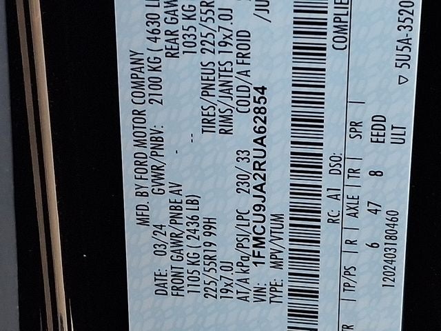 THIS VEHICLE INCLUDES THE FOLLOWING FEATURES AND OPTIONS: AWD, 2.91 Axle Ratio, 4-Wheel Disc Brakes, 6 Speakers, ABS brakes, Air Conditioning, Alloy wheels, AM/FM radio: SiriusXM, AM/FM Stereo, Auto High-beam Headlights, Auto-dimming Rear-View mirror, Automatic temperature control, Brake assist, Bumpers: body-color, Compass, Delay-off headlights, Driver door bin, Driver vanity mirror, Dual front impact airbags, Dual front side impact airbags, Electronic Fuel Door Release, Electronic Stability Control, Emergency communication system: SYNC 4 911 Assist, Exterior Parking Camera Rear, FordPass Connect, Four wheel independent suspension, Front anti-roll bar, Front Bucket Seats, Front Center Armrest, Front dual zone A/C, Front fog lights, Front reading lights, Fully automatic headlights, Garage door transmitter, Heated ActiveX Trimmed Front Sport Contour Bucket Seats, Heated door mirrors, Heated front seats, Heated steering wheel, Illuminated entry, Knee airbag, Low tire pressure warning, Memory seat, Navigation system: Connected Navigation, Neutral Towing Capability, Occupant sensing airbag, Outside temperature display, Overhead airbag, Overhead console, Panic alarm, Passenger door bin, Passenger vanity mirror, Pedestrian Alert Sounder, Power door mirrors, Power driver seat, Power Liftgate, Power passenger seat, Power steering, Power windows, Radio data system, Rain sensing wipers, Rear anti-roll bar, Rear reading lights, Rear seat center armrest, Rear window defroster, Rear window wiper, Remote keyless entry, Roof rack: rails only, Security system, Speed control, Speed-sensing steering, Speed-Sensitive Wipers, Split folding rear seat, Spoiler, Steering wheel mounted audio controls, SYNC 4 w/Enhanced Voice Recognition, Tachometer, Telescoping steering wheel, Tilt steering wheel, Traction control, Trip computer, Variably intermittent wipers, and Wheels: 19 Machined-Face Aluminum.
