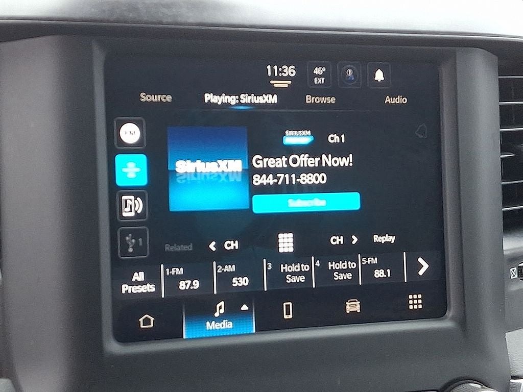 This Vehicle Includes the Following Options: Level 1 Equipment Group (2 Way Rear Headrest Seat, 2nd Row In Floor Storage Bins, 4 Way Front Headrests, 40/20/40 Split Bench Seat, 4G LTE Wi-Fi Hot Spot, 8.4 Touchscreen Display, Apple CarPlay, Auto Power-Folding Mirrors, Big Horn IP Badge, Black Exterior Mirrors, Bluetooth® Handsfree Phone & Audio, Center Hub, Connectivity - US/Canada, Dual Glove Boxes, Exterior Mirrors Courtesy Lamps, Exterior Mirrors w/Heating Element, Exterior Mirrors w/Supplemental Signals, Foam Bottle Insert (Door Trim Panel), Footwell Courtesy Lamp, For Details, Visit DriveUconnect.com, For More Info, Call 800-643-2112, Forward & Reverse Utility Lights, Front Armrest w/Cupholders, Front Center Seat Cushion Storage, Front Fog Lamps, Front Seat Back Map Pockets, Global Telematics Box Module (TBM), Glove Box Lamp, Google Android Auto, GPS Antenna Input, Integrated Center Stack Radio, Integrated Voice Command w/Bluetooth®, Leather Wrapped Steering Wheel, Locking Lower Glove Box, Manual Adjust 4-Way Front Passenger Seat, Mirror Running Lights, Power 2-Way Driver Lumbar Adjust, Power Adjust 8-Way Driver Seat, Power Adjust Mirrors, Power Adjustable Convex Aux Mirrors, Power Heated Fold Telescope Mirrors, Power Telescoping Mirrors, Rear 60/40 Folding Seat, Rear Dome w/On/Off Switch Lamp, Remote USB Port - Charge Only, Selectable Tire Fill Alert, SiriusXM Radio Service, SiriusXM Satellite Radio, Steering Wheel Mounted Audio Controls, Storage Tray, and Wheels: 18 x 8.0 Polished Aluminum), Quick Order Package 2GZ Big Horn, 3.73 Axle Ratio, 4-Wheel Disc Brakes, 6 Speakers, ABS brakes, Active Noise Control System, Air Conditioning, Brake assist, Bumpers: chrome, Center Stack Storage Drawer, Chrome Flat Cab-Length Side Steps, Cloth 40/20/40 Bench Seat, Compass, Delay-off headlights, Driver door bin, Dual front impact airbags, Dual front side impact airbags, Electronic Stability Control, Electronically Controlled Throttle, Emergency communication system: SiriusXM Guardian, Front anti-roll bar, Front Center Armrest w/Storage, Front License Plate Bracket, Front reading lights, Fully automatic headlights, Heated door mirrors, Illuminated entry, Low tire pressure warning, Manual Adjust 4-Way Driver Seat, Manufacturer's Statement of Origin, Occupant sensing airbag, Outside temperature display, Overhead airbag, Overhead console, Panic alarm, ParkView Rear Back-Up Camera, Passenger door bin, Passenger vanity mirror, Power door mirrors, Power steering, Power windows, Premium Cloth 40/20/40 Bench Seat (DISC), Radio data system, Radio: Uconnect 3 w/5 Display, Radio: Uconnect 5 W w/8.4 Display, Rear anti-roll bar, Rear Folding Seat, Rear seat center armrest, Rear step bumper, Remote keyless entry, Speed control, Tachometer, Tilt steering wheel, Tip Start, Tow Hooks, Traction control, Trip computer, Turn signal indicator mirrors, Variably intermittent wipers, Voltmeter, and Wheels: 18 x 8.0 Steel Chrome ClaD.