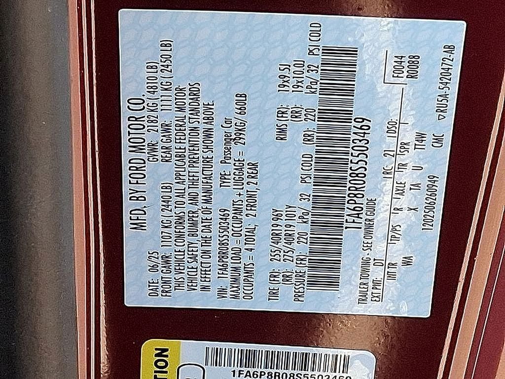THIS VEHICLE INCLUDES THE FOLLOWING FEATURES AND OPTIONS: Equipment Group 700A Deluxe Package (Aluminum Foot Pedals, Approach Detection, Cloth/Vinyl Climate-Controlled Bucket Seats, Driver Seat & Mirrors Memory, and Universal Garage Door Opener (UGDO)), RECARO Sport Seats (RECARO Micro-Suede/Vinyl Bucket Seats), Security Package (Active Anti-Theft System, Locking Center Console, and Wheel Locking Kit), 12 Speakers, 4-Wheel Disc Brakes, ABS brakes, Adaptive suspension, Air Conditioning, Alloy wheels, AM/FM radio: SiriusXM with 360L, AM/FM Stereo, Auto High-beam Headlights, Auto-dimming Rear-View mirror, Automatic temperature control, B&O Sound System by Bang & Olufsen, Brake assist, Bumpers: body-color, Cloth/Vinyl Heated Bucket Seats, Compass, Delay-off headlights, Driver door bin, Driver vanity mirror, Dual front impact airbags, Dual front side impact airbags, Electronic Stability Control, Emergency communication system: 911 Assist, Exterior Parking Camera Rear, Four wheel independent suspension, Front anti-roll bar, Front Bucket Seats, Front Center Armrest, Front dual zone A/C, Front reading lights, Fully automatic headlights, HD Radio, Heated front seats, Heated steering wheel, Hood Accent Stripe Delete, Illuminated entry, Internet access capable: FordPass Connect, Knee airbag, Low tire pressure warning, Navigation system: Connected Navigation, Occupant sensing airbag, Outside temperature display, Overhead airbag, Overhead console, Panic alarm, Passenger door bin, Passenger vanity mirror, Power door mirrors, Power driver seat, Power passenger seat, Power steering, Power windows, Radio data system, Rain sensing wipers, Rear anti-roll bar, Rear Parking Sensors, Rear window defroster, Remote keyless entry, SiriusXM w/360L, Speed control, Speed-sensing steering, Speed-Sensitive Wipers, Split folding rear seat, Spoiler, Sport steering wheel, Steering wheel mounted audio controls, SYNC 4, Tachometer, Telescoping steering wheel, Tilt steering wheel, Traction control, Trip computer, Variably intermittent wipers, Voltmeter, and Wheels: 19 x 9.5 Fr & 19 x 10 Rr Aluminum.